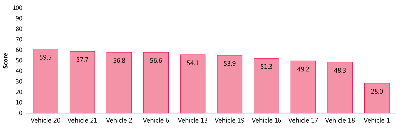 The Bottom Performers graph displays the bottom 10 performers based on their overall safety score. This graph helps visualize the lowest performing drivers in your fleet, and complements any driver safety coaching programs.
