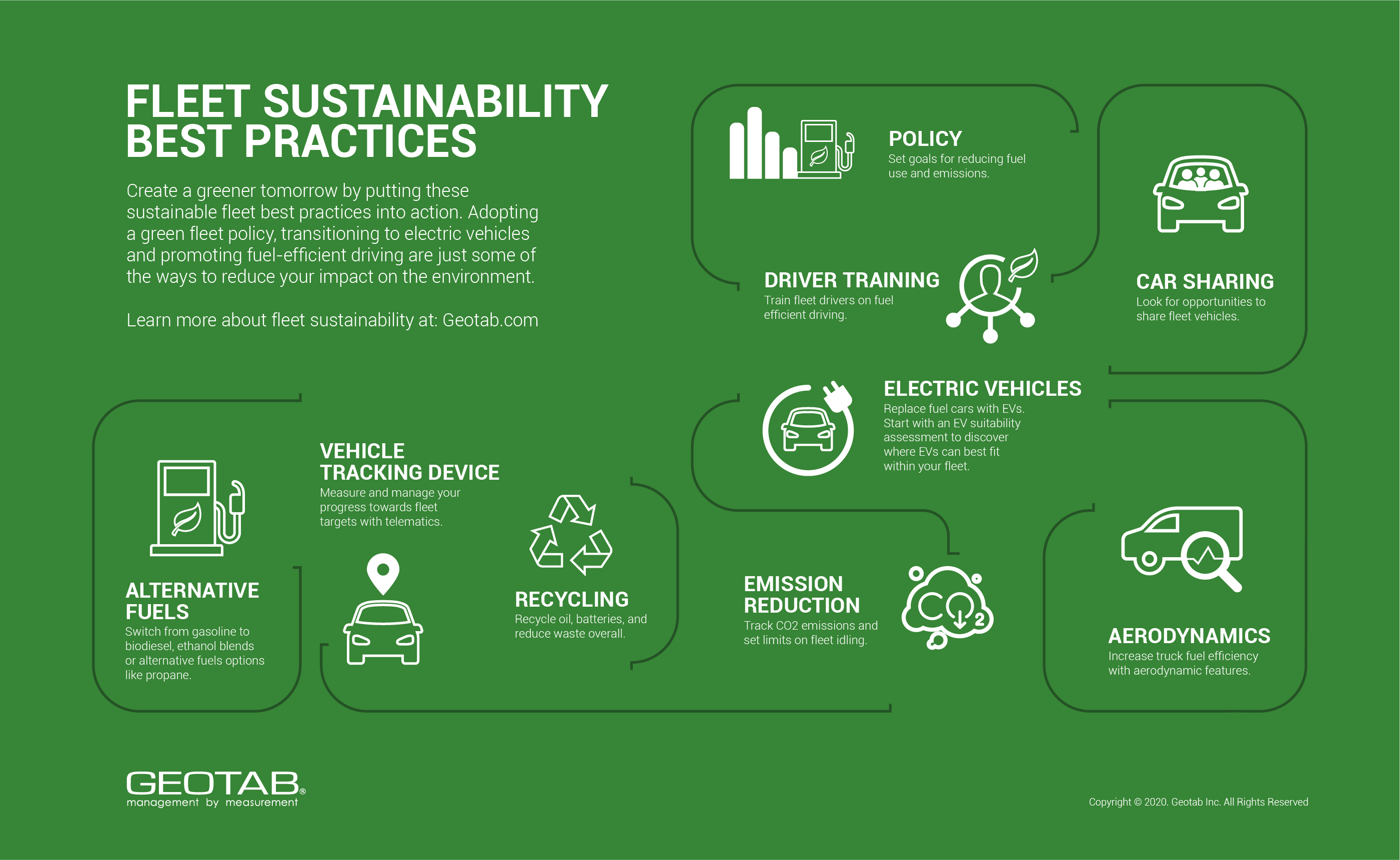 Green fleets undertake a range of initiatives, from policy to proactive tracking, to reduce their environmental impact. We created this infographic to illustrate the top areas to focus on for fleet sustainability. For more details about the newest pillar, visit our sustainability page.