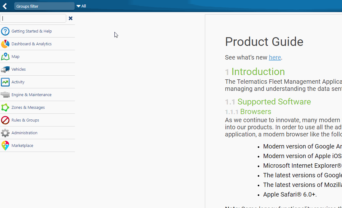 Find what you need faster with the new MyGeotab menu search function. Just click the search icon at the top of the menu. Search by keyword or by name to quickly find the page you are looking for.