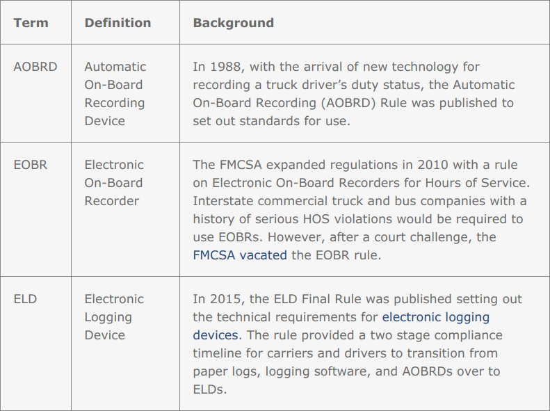 You may see a few different terms used in relation to keeping records of duty status (RODs), including AOBRD, EOBR and ELD. Here is a quick definition of each term and the related regulations.