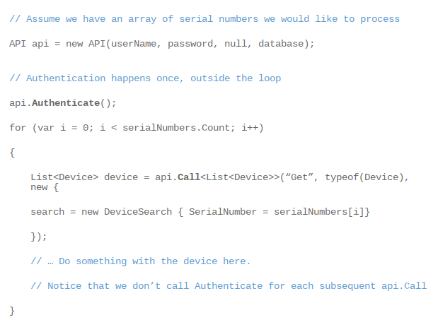 A: The .Net assembly provided by Geotab already has built-in logic for handling Authentication, credentials expiry and database moves efficiently. When used correctly, no changes are needed. However, it is still possible to write code that constantly make Authentication calls for every operation.