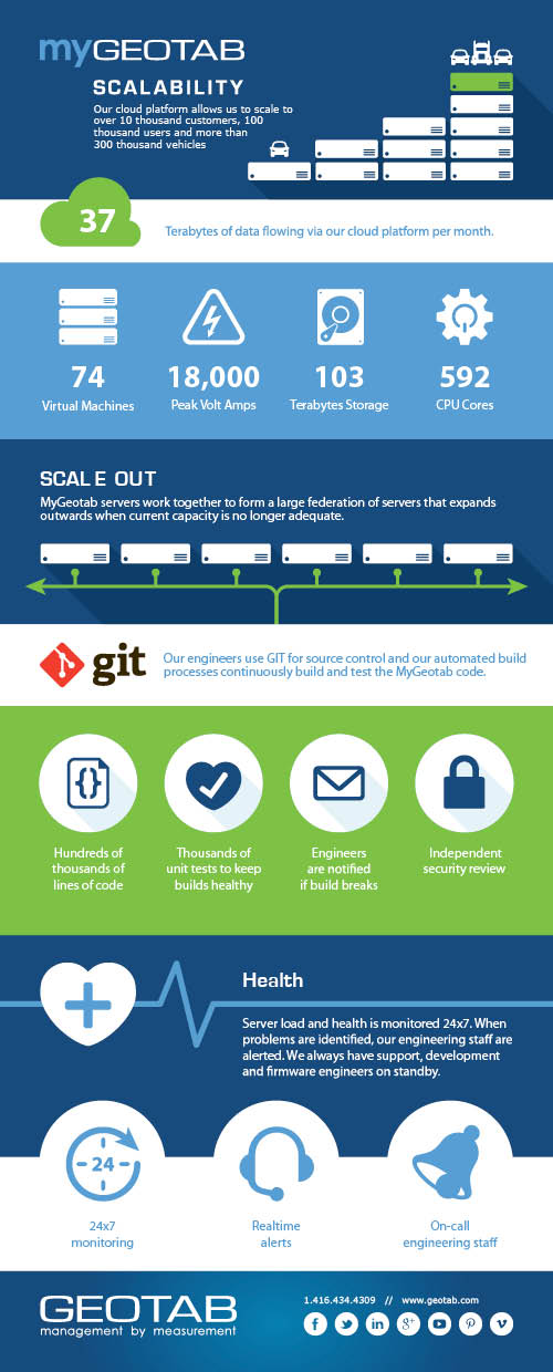 It takes a big team effort to build a highly scalable telematics platform. Everything from system architecture, implementation, security, infrastructure, process automation, and production support need to come together to make our hosted solution world class. All that complexity is happening behind the scenes so our customers can focus on solving their business problems. In the following infographic, we take you behind the scenes and show you how it all comes together.