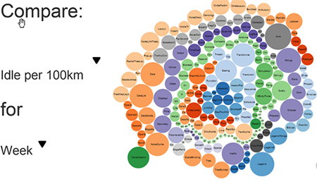 One way to facilitate manageable views of the same data is a configurable graphical representation, as seen below. The different colors represent different regions and each bubble symbolizes a driver – safe and efficient drivers may be identified and rewarded while outliers may be proactively coached within their region or globally.