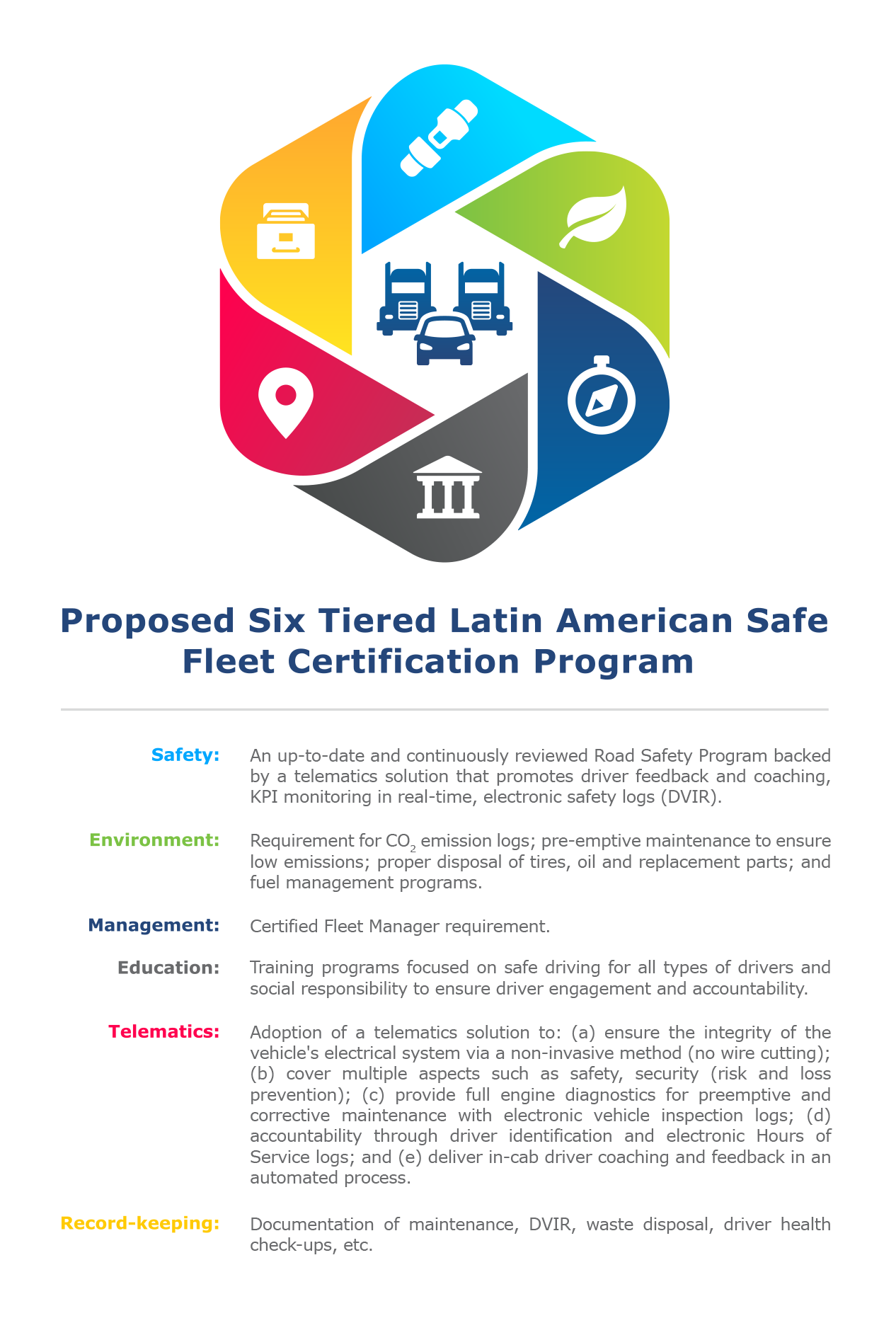 Currently, there are several local certification programs for fleet managers, but our proposal here is a regional standardized certification for the fleet, such as a Safe and Environment Fleet Certification, or SEF Certified. The proposed Regional Latin American Safe Fleet Certification Program should address but not be limited to the following areas: Safety, Environment, Management, Education, Telematics, and Record-keeping.