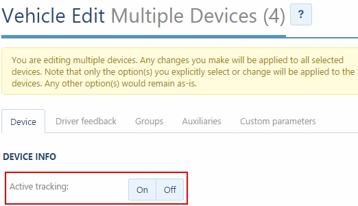 Previously, Active Tracking was enabled vehicle by vehicle. However, to accommodate managers of larger fleets, a new enhancement makes it possible to enable Active Tracking for an entire group of vehicles at once.