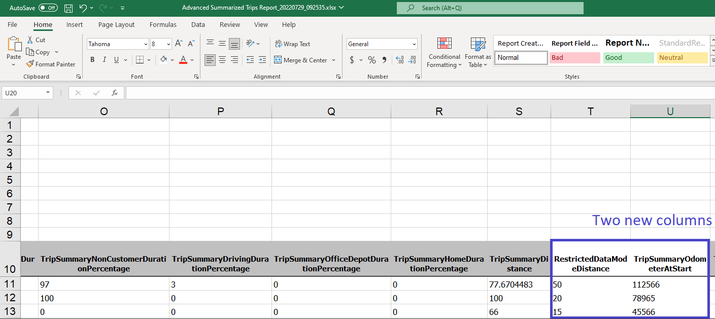 We’ve added two new columns to the Data sheet of the Trips Summary reports (Standard and Advanced):