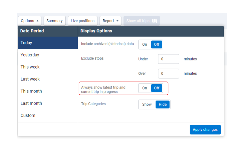 The option to Always show the latest trip and current trip in progress is now out of Feature Preview! To enable this feature, use the Options dropdown menu on the Trips History page, and configure the Date Period to Today or a Custom date starting no earlier than the current day. In the Display Options panel, enable the Always show the latest trip and current trip in progress toggle and click Apply changes.