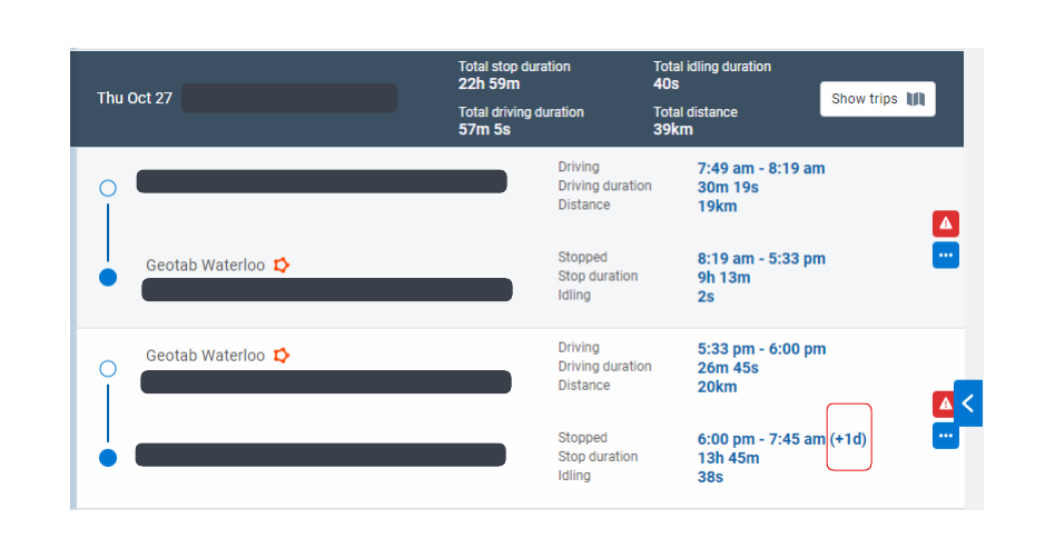 You can now see the exact time that has passed since the beginning of a trip. Previously, only the timestamps for Trips and Stops display on the Trips History page, which can be misleading when they span over multiple days. To indicate that a trip spans over multiple days, we’ve added the number of elapsed days in parentheses beside the timestamp.