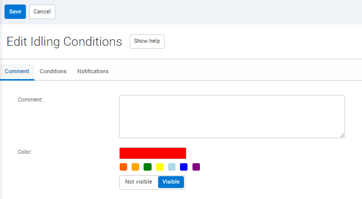 The Edit conditions option refreshes the page to display the Edit Idling Conditions page. On the Edit Idling Conditions page, you can add a description and assign a color, and configure the settings under the Conditions and Notifications tab.