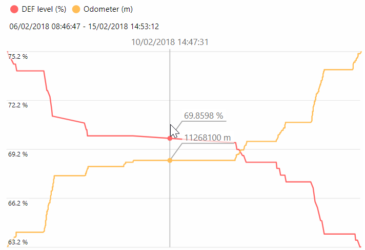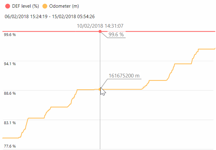 Take for example, the AdBlue levels in the following two vehicles (same make and model) over the same time period. We compared their engine odometer readings with their AdBlue levels.