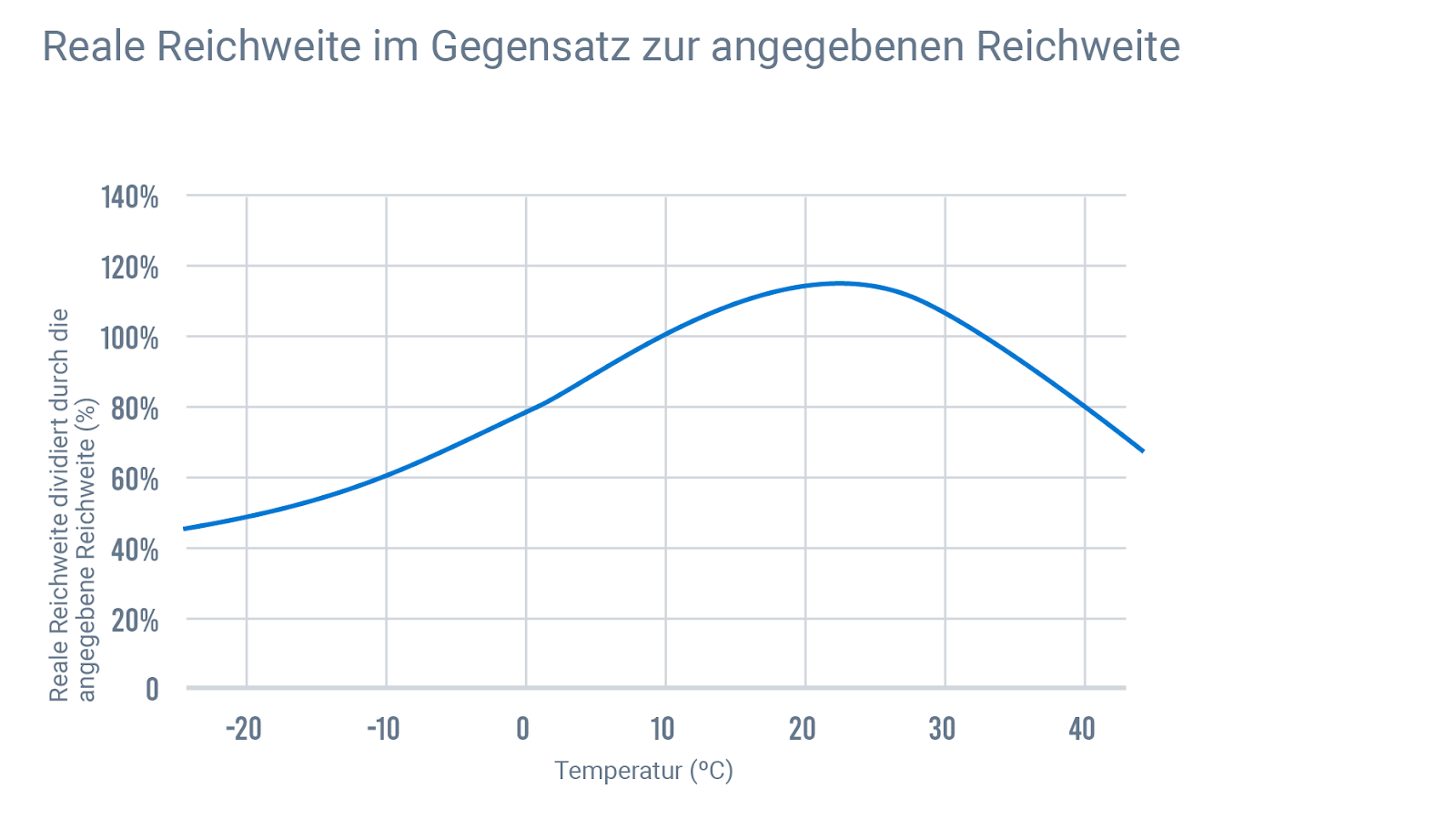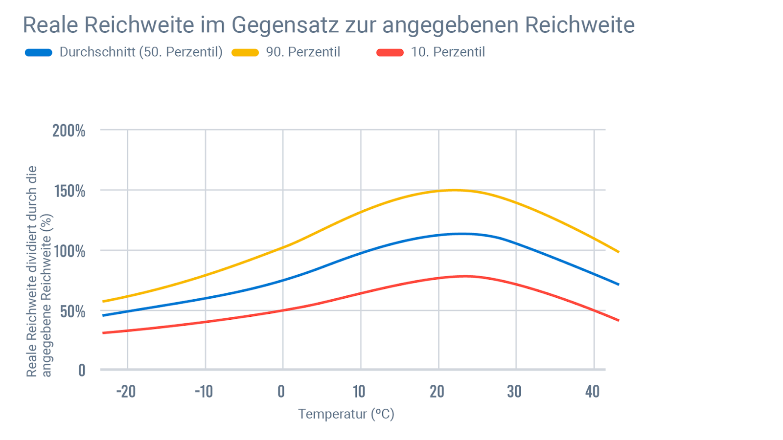 Kälte ist also immer ein Problem, aber Hitze ist ebenfalls nicht gut. Wenn man genau hinsieht, fällt die Reichweite sogar etwas schneller ab (die Kurve ist hier steiler), wenn die Temperatur steigt. In der Realität treten die Auswirkungen hoher Temperaturen jedoch nicht so stark in Erscheinung, da das Klima der Erde Temperaturen über 50 °C nicht oft hergibt. Wir wissen also nicht (und müssen hoffentlich auch nicht wissen), was über diesen Punkt hinaus mit der Reichweite passiert.