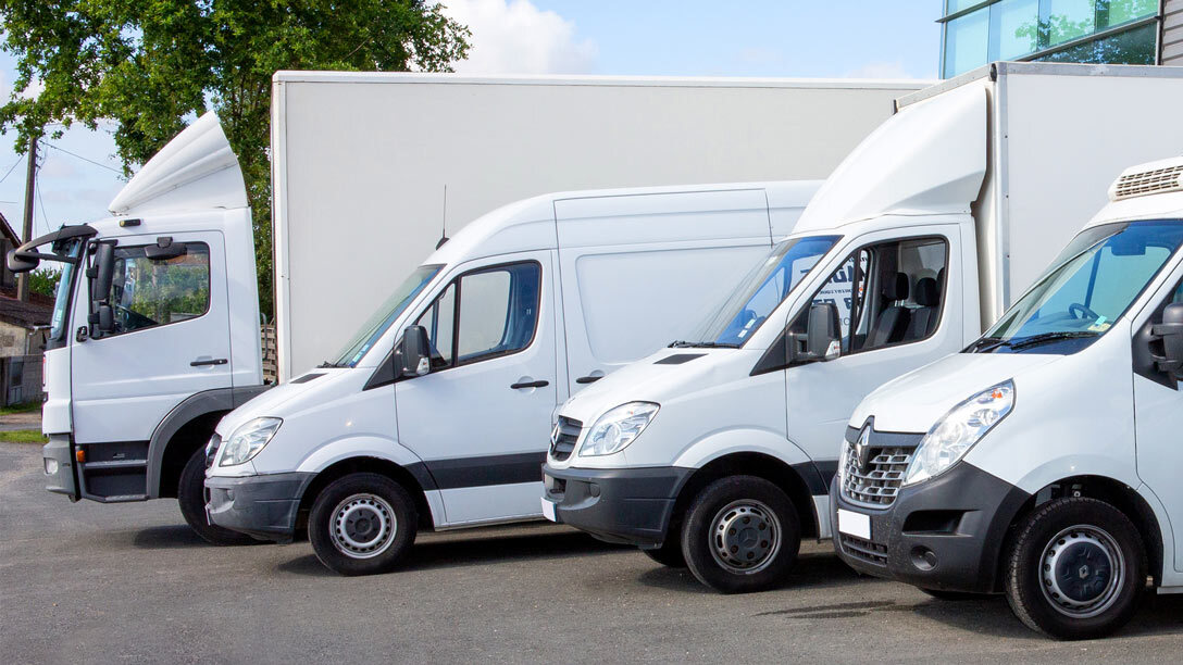 Plusieurs véhicules blancs garés côte à côte, dont un petit camion et 3 camionnettes.