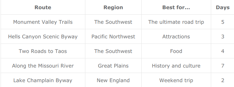 - Three Southwest routes also place in the top 10 (Monument Valley Trails, Grand Canyon Road Trip, Bryce & Zion National Parks)