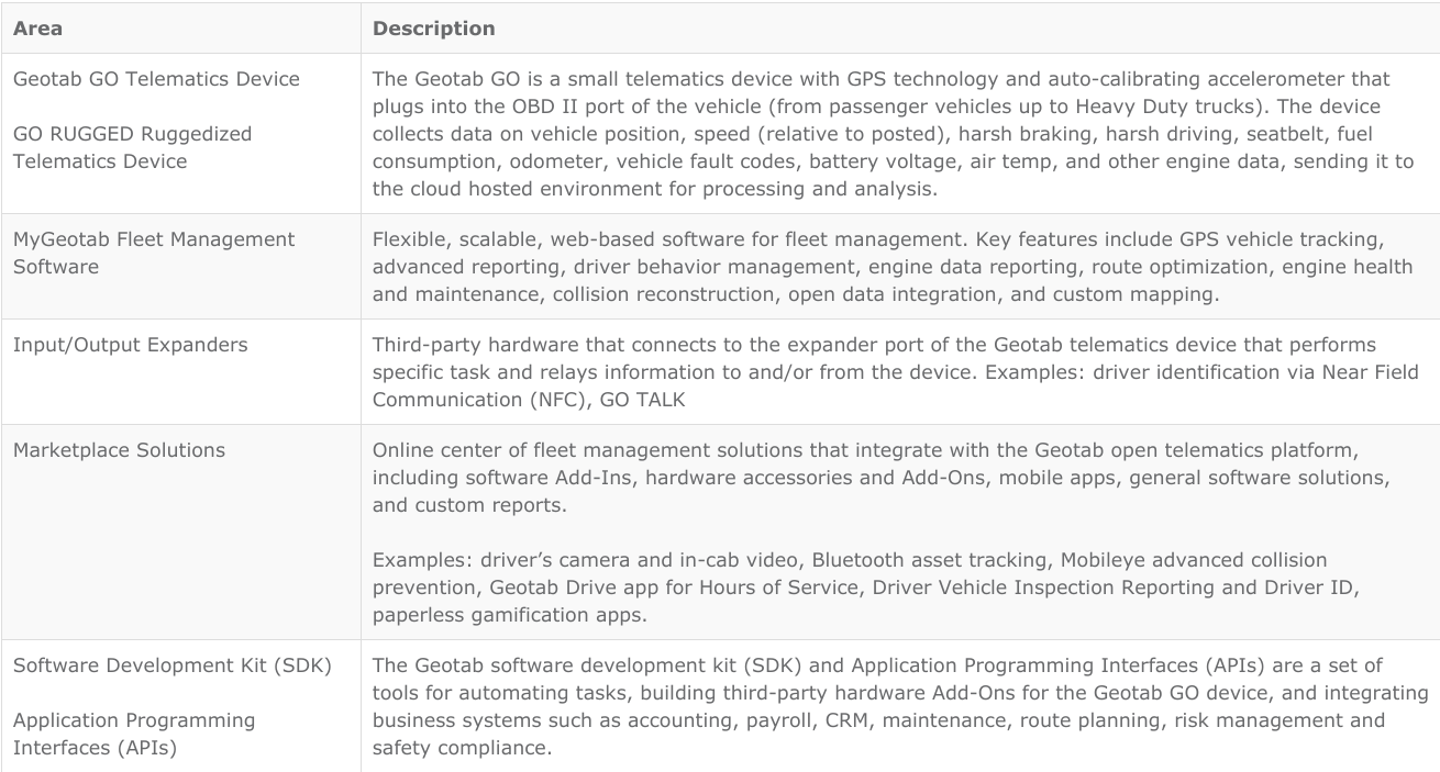 Open platform telematics can be viewed as the Internet of Things (IoT) hub of the vehicle, connecting multiple devices to the vehicle through one centralized communications system. An expanding list of third-party devices can be integrated with telematics, such as these solutions from the Geotab Marketplace: