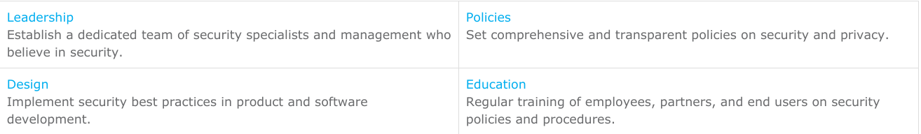 Protecting telematics data requires a comprehensive, proactive approach. The integrity of the system relies on the upkeep of many sub-systems, each with its distinct set of potential vulnerabilities. Therefore, in addition to strong policies and processes, creating a culture of security across the organization is the best way to protect data and create resiliency against malicious attacks. In general, telematics security can be strengthened with these principles from IoT security[3,4]:
