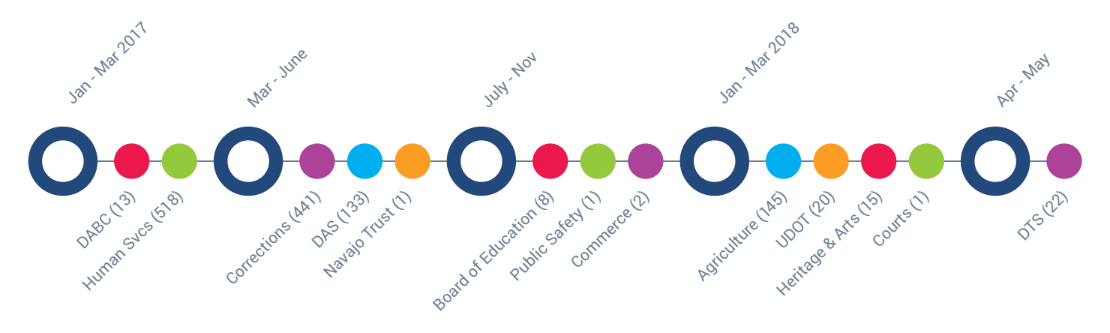 - Departments of Administrative Services (DAS), Human Services (DHS), Corrections, Agriculture, Alcoholic Beverage Control (DABC), Technology Services (DTS), Transportation (UDOT), Heritage and Arts (DHA), and Board of Education.