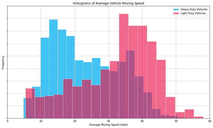 As an example, see below for a real distribution of vehicle speeds along the Cheyenne Ave corridor in Las Vegas, running between North Rancho Drive and the Las Vegas Freeway (Interstate 15). This bimodal distribution is a typical one as vehicles naturally cluster into larger slower moving vehicles or smaller faster moving ones. This information is a critical input into any traffic signal progression model. The next step is to identify the peak periods for heavy duty and light duty vehicles and coordinate signals accordingly. This data may inform us that it is more valuable to favor light duty vehicles during the traditional morning and afternoon commute times versus heavy duty vehicles during the very early mornings and midday.