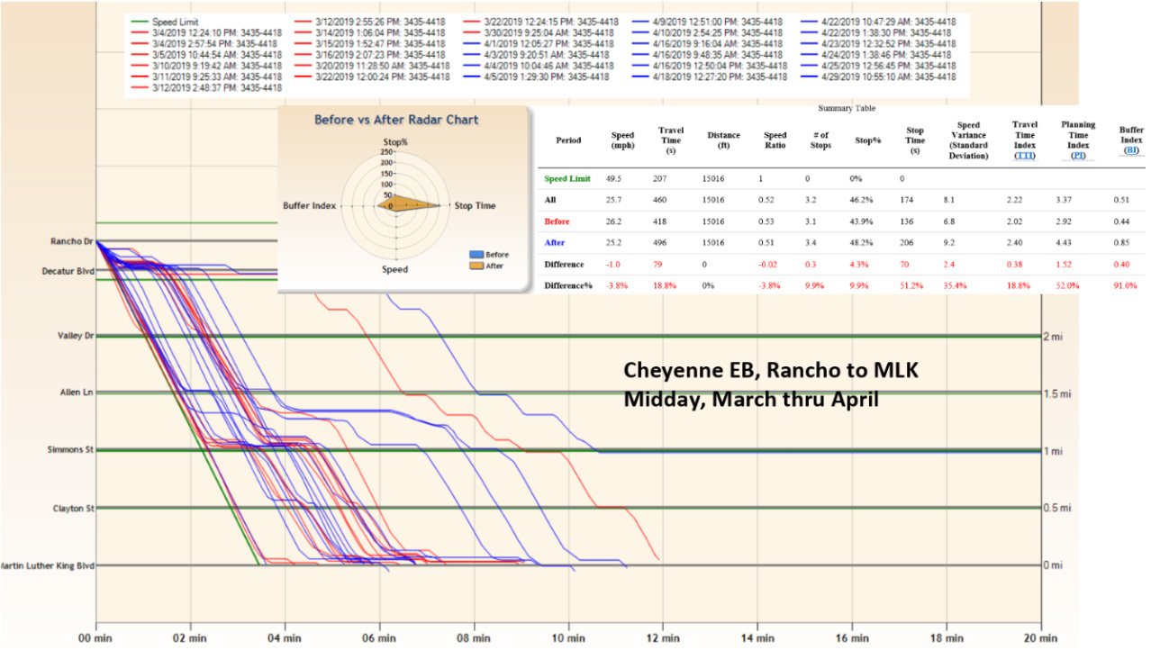 This trend is further illustrated in RTC’s trajectory plots shown in Figure 5, where you see actual vehicle trajectories and travel profiles through the Cheyenne Ave corridor. Note that some vehicles take much longer than would otherwise be expected to traverse the corridor.