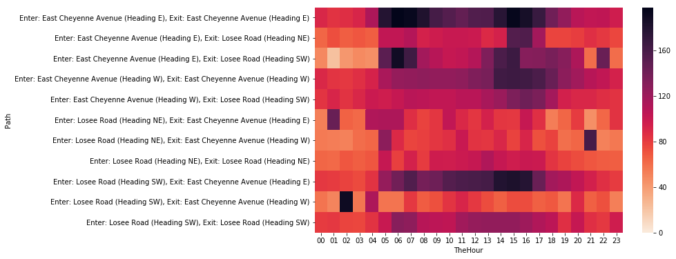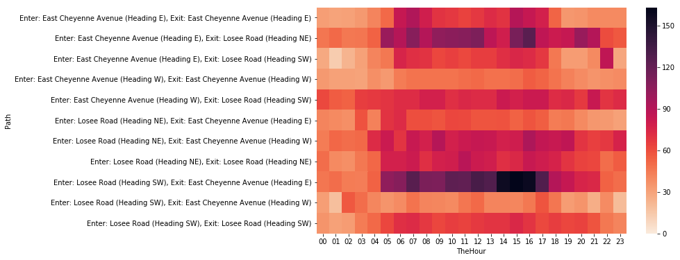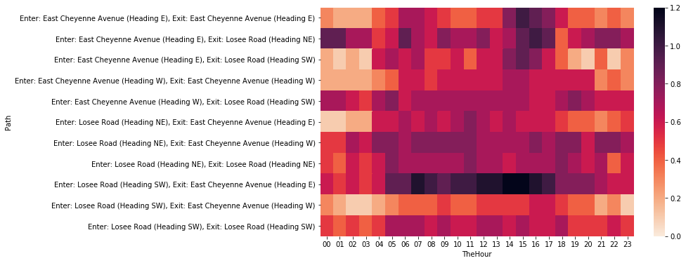 Figure 7 shows the average time from first stop to clear the intersection is much higher for left turns heading South West on Losee. It also shows extended wait times turning left off of Cheyenne heading East and onto Losee heading North East at certain times of the day. The through directions are likely prioritized for this corridor as we see much lower time from first stop for East and Westbound traffic on Cheyenne, with slightly more congestion in the Eastbound direction.